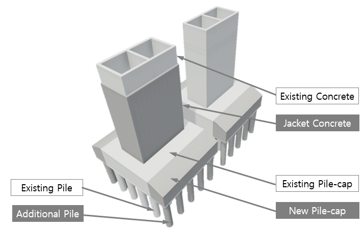 To verify pile bearing capacity, the dynamic load test of the piles was carried out and confirmed. However, due to insufficient bearing capacity, additional piles were introduced. To retrofit of additional piles, the pile caps were proposed to reinforce concrete extension by using dowel bars to bond the existing concrete with the new concrete.